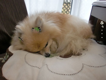 いつものいちご用クッションに乗って寝るの。