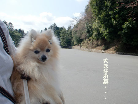 とてとて歩いていたら大きなお墓に着いたから記念撮影なの。