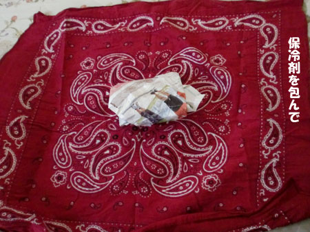 バンダナと保冷剤と広告と髪をとめるゴムなんだって。