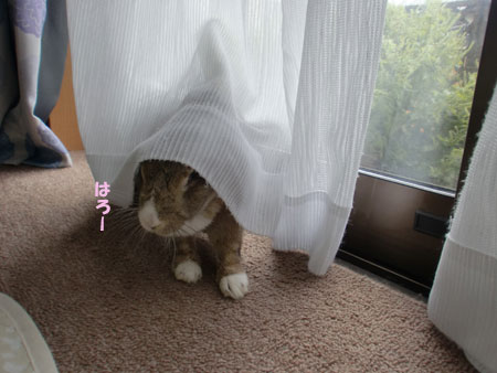 カーテンから顔を出す綿ちゃん、レオンと同じだぁ~!