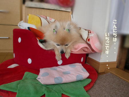 いつものいちご用クッションに乗って寝るの。